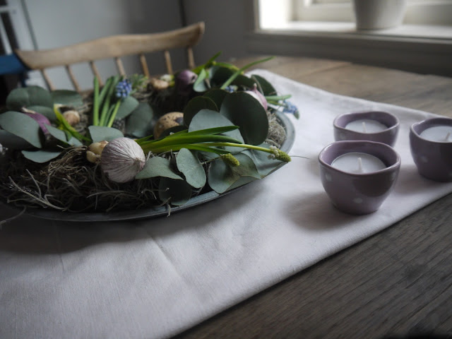 | Denna våriga krans pryder köksbordet... |